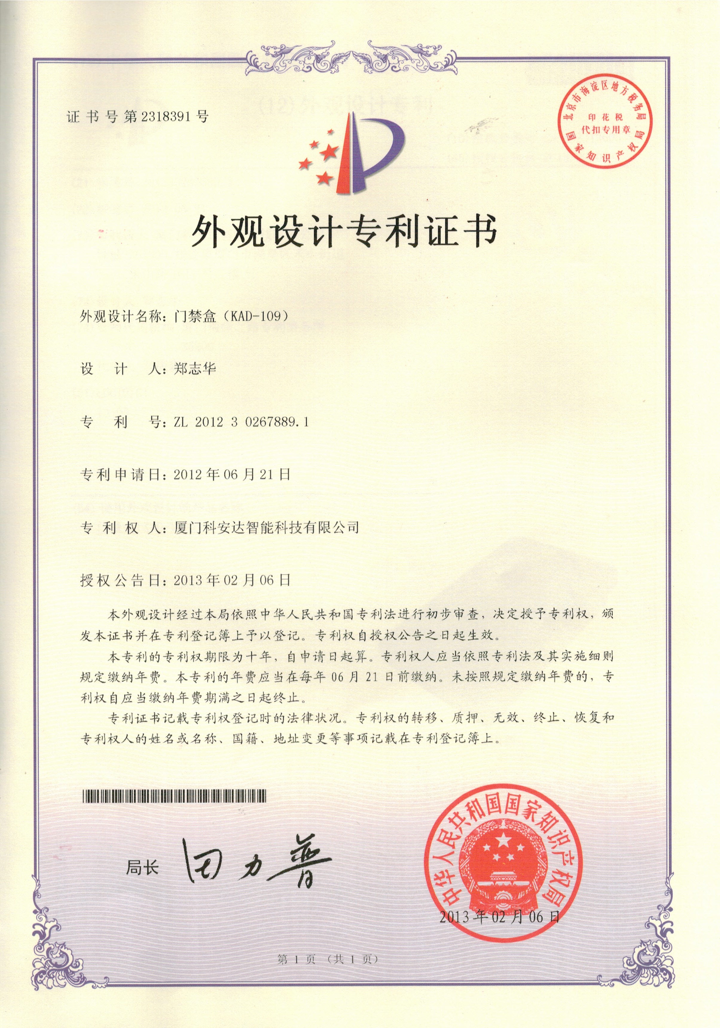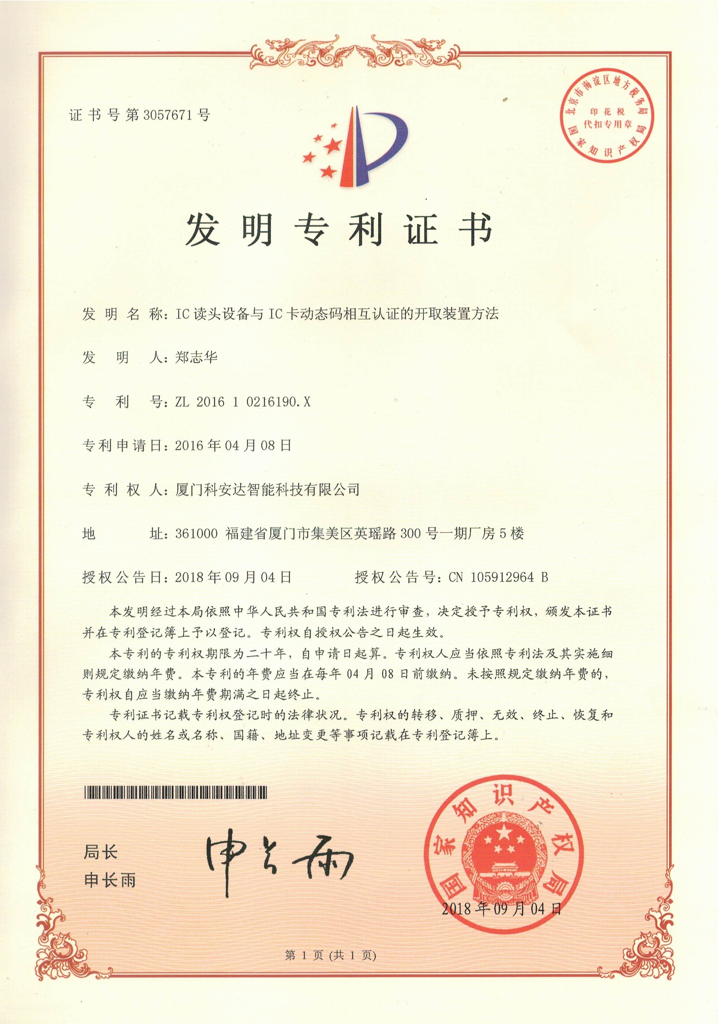 防復(fù)制發(fā)明專利證書
